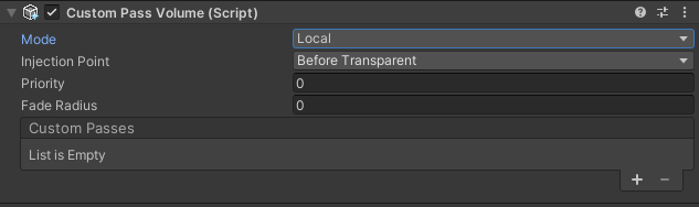This property only appears when **Mode** is set to **Local**. | | Custom Passes | Click the Add (**+**) button to create a Custom Pass. The Custom Pass Volume component has the following types of Custom Passes available by default: