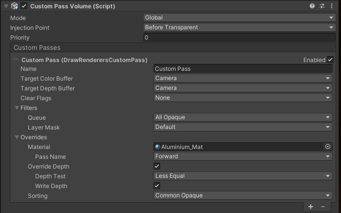 | Priority | If you have more than one Custom Pass Volume assigned to the same injection point, use this property to control the order that Unity executes them in.