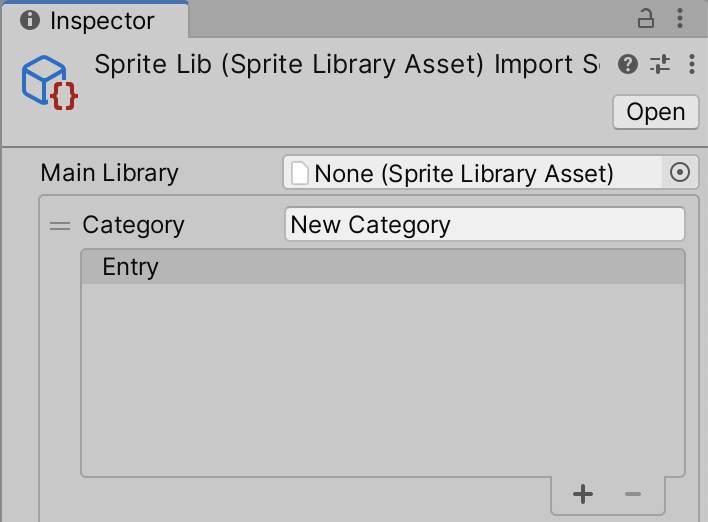 2. Select the new Sprite Library Asset and go to its Inspector window. The window displays the list of [Categories](SLAsset.md#category) and [Labels](SLAsset.md#entry) available in the Asset.
