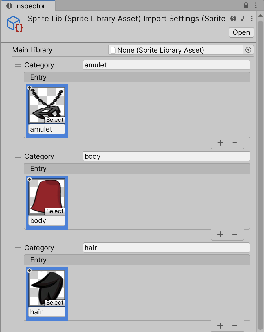 3. [Create a Sprite Library Asset](SpriteSwapSetup.md) and assign each Sprite of the actor to a unique [Category](SLAsset.md#Category). It is suggested to name each Category and Label after the respective body part of the actor for convenience. Apply the changes once complete.