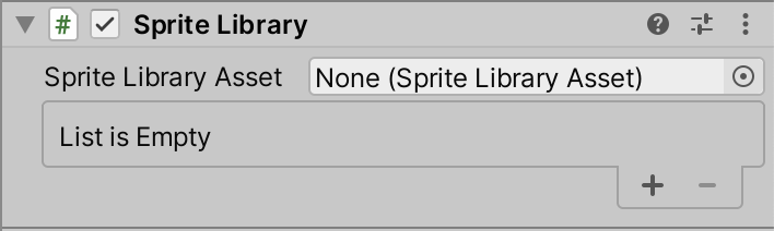 6. Add the [Sprite Library](SLAsset.md#sprite-library-component) component to the same GameObject. Assign the Sprite Library Asset created in step 3 to **Sprite Library Asset**.