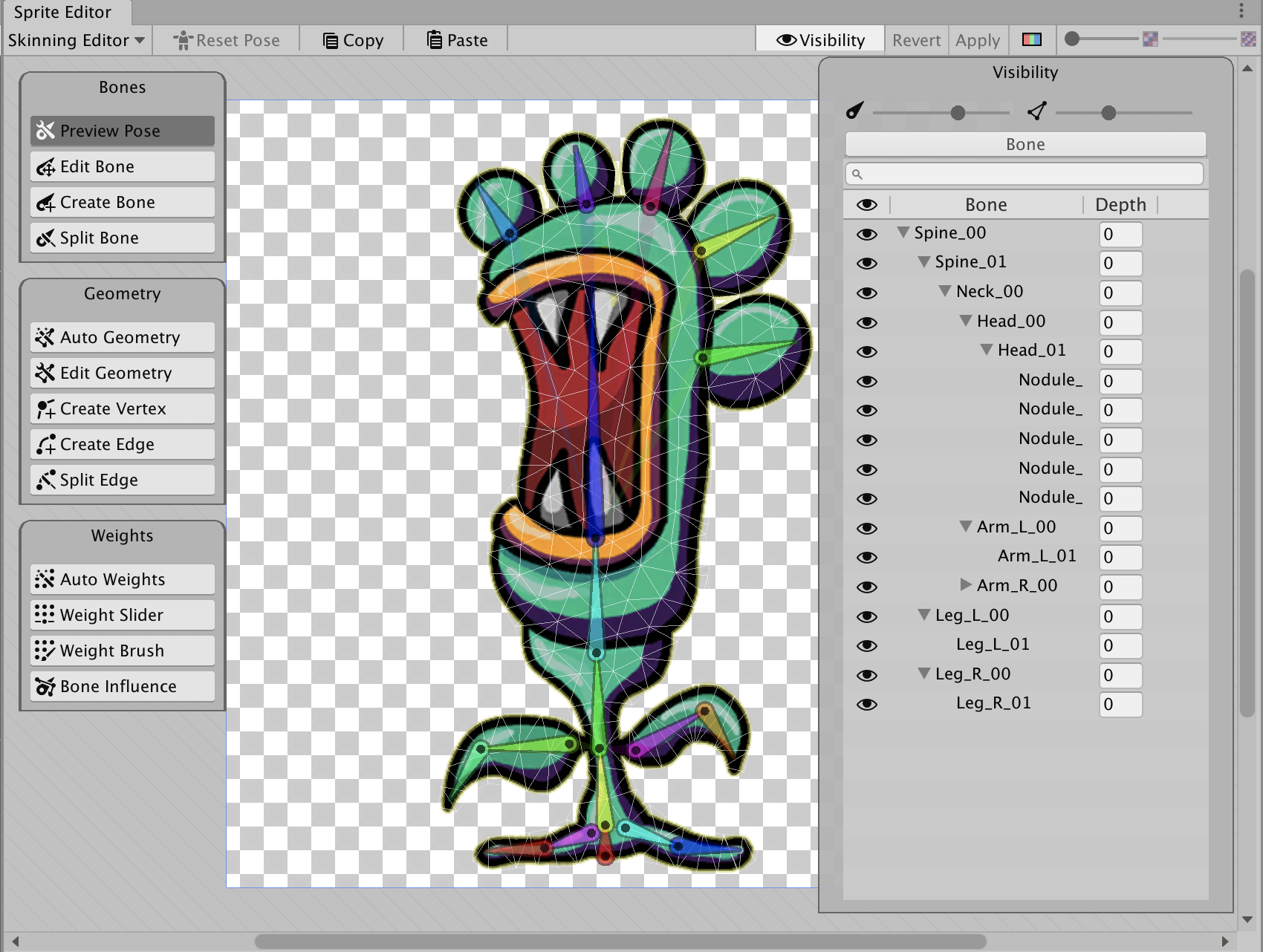 # Single Sprite rig with bone branching This sample project is a slightly more complex example of a single Sprite rig similar to the [Simple](ex-simple.md) project, but with bone branching instead of a single branch rig. The Sprite is imported with its **Texture Type** set to Sprite (2D and UI) and **Sprite Mode** set to Single. The Project and Assets can be found in the following location (the version number folder may differ): ![](images/2D-animation-samples-single-skin-sample.png) Open the Asset `Assets/Samples/2D Animation/[X.Y.Z]/Samples/2 Single Skinned Sprite/Sprites/Plunkah.png` in the [Skinning Editor](SkinningEditor.md) module to examine how the Sprite is rigged. ![](images/2D-animation-samples-single-skin-skinning-module.png) The `_Single Skinned Sprite` sample Scene show how the Asset is used in a Scene when it is animated with animation that [deforms](SpriteSkin.md) its Sprite mesh. ![](images/2D-animation-samples-single-skin-rig.png) Follow the steps below to reconstruct the `_Single Skinned Sprite` sample Scene: 1. Create a new Scene, and create an empty GameObject. Name this GameObject 'Plunkah'.