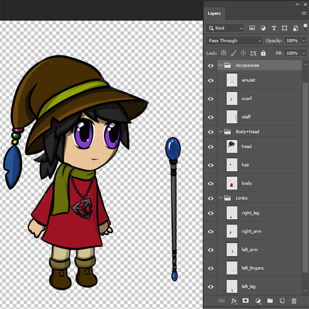 Refer to the examples below of a character designed in Photoshop, and how its original layer hierarchy is transposed to the Prefab.