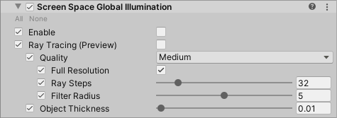 - To not use ray tracing and instead use the screen-space global illumination solution, disable **Ray Tracing** in the Inspector and see [Screen-space](#screen-space) for the list of properties.