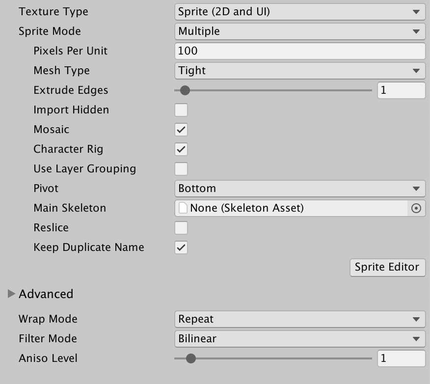| Multiple | This is the default option. Select this if the imported texture has multiple parts or elements, and is ideal for complex characters which have different parts which are split between multiple layers in the source .psb file as it prepares the characters for animation with the [2D Animation](https://docs.unity3d.com/Packages/com.unity.2d.animation@latest) package. |