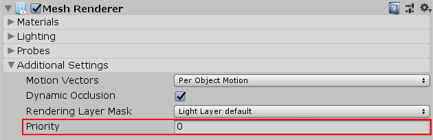 Mesh Renderers have a **Priority** property to sort Renderers using the same Material in your Scene.