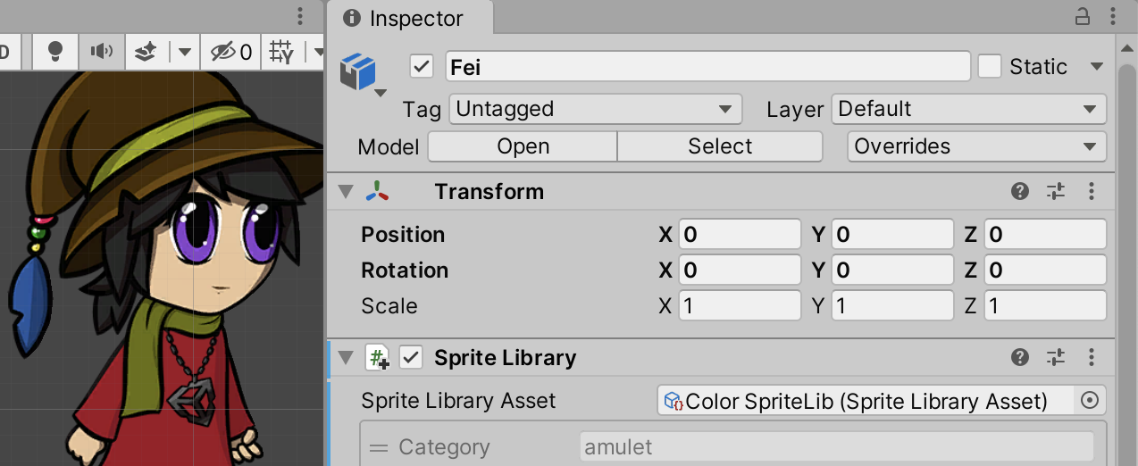 5. Drag the color Model Prefab into the Scene view, and go to the root GameObject. Add a [Sprite Library component](SLAsset.md#sprite-library-component) to the root GameObject and assign the color Sprite Library Asset created in step 3 to the **Sprite Library Asset** property.