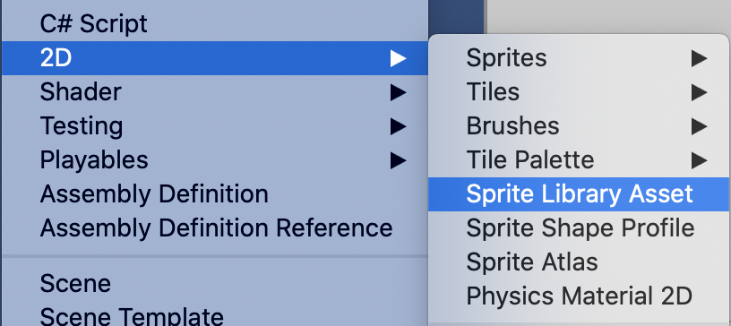 1. Select the Sprite Library Asset from the Asset creation menu by going to **Asset > Create > 2D > Sprite Library Asset**