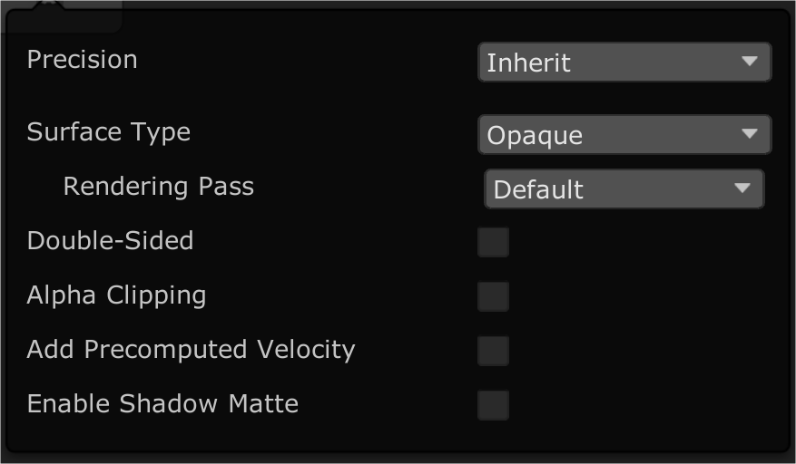 | **Precision** |Select the precision of the calculations that the Shader processes. Lower precision calculations are faster but can cause issues, such as incorrect intensity for specular highlights.