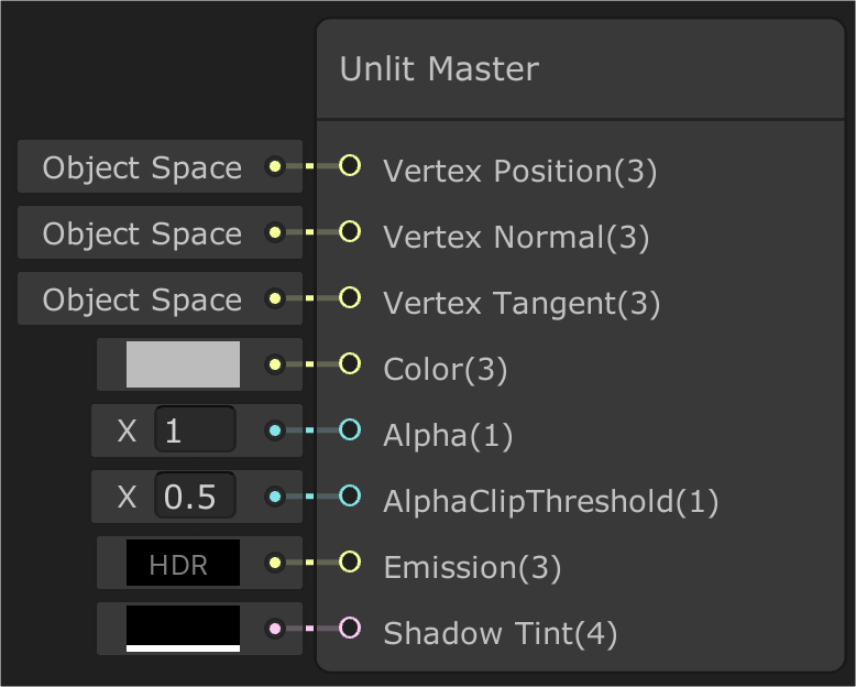 - **[Master node input ports](#InputPorts)**: Shader Graph input ports on the master node itself that you can connect to the output of other nodes or, in some cases, add your own values to.