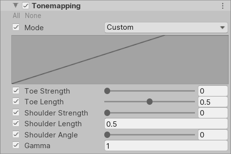 • **Custom**: Use this option if you want to specify the tonemapping settings yourself. Selecting this mode exposes properties that allow you to customize the tonemapping curve.