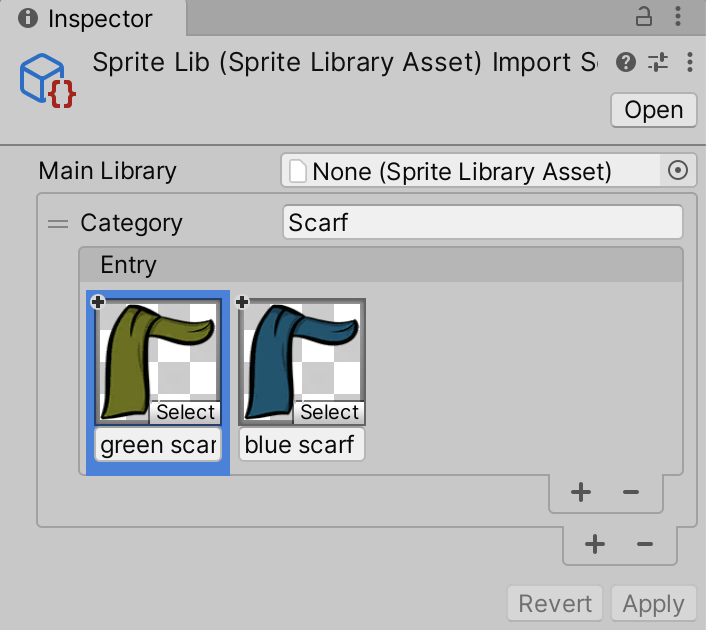 6. Add the [Sprite Library](SLAsset.md#sprite-library-component) component to the same GameObject. Assign the Sprite Library Asset created in step 3 to **Sprite Library Asset**.