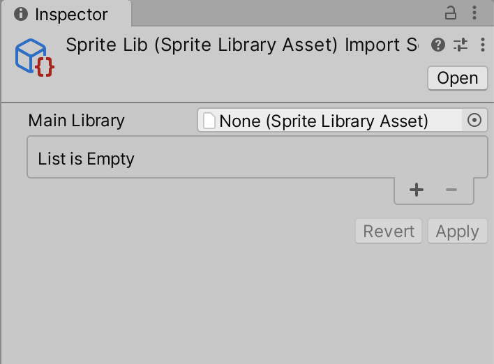 2. Select the new Sprite Library Asset and go to its Inspector window. The window displays the list of [Categories](SLAsset.md#category) and [Labels](SLAsset.md#entry) available in the Asset.