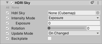 • **Realtime**: HDRP updates the sky environment at regular intervals defined by the **Update Period**. | | - **Update Period** | Set the period (in seconds) for HDRP to update the sky environment. Set the value to 0 if you want HDRP to update the sky environment every frame. This property only appears when you set the **Update Mode** to **Realtime**. | ## Advanced Properties ![](Images/Override-HDRISky2.png) These properties only appear if you enable [more options](More-Options.md). | Property | Description | | -------------------------------- | ------------------------------------------------------------ | | **Backplate** | Indicates whether to project the bottom part of the HDRI onto a plane with various shapes such as a Rectangle, Circle, Ellipse, or Infinite plane. | | - **Type** | Specifies the shape of the backplate. The options are: