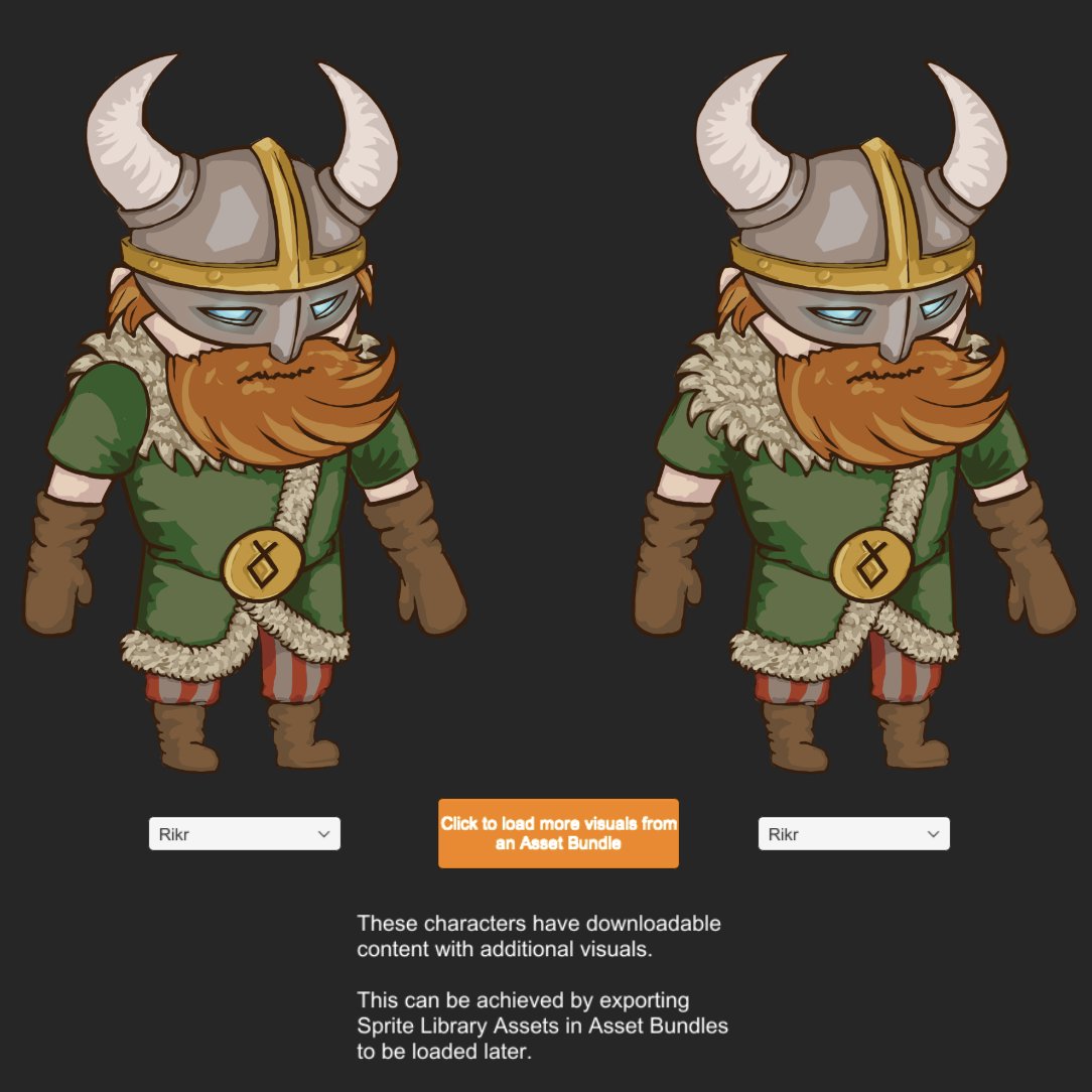 This difference from the Full Skin Swap method is that the Sprite Library Asset is loaded from an AssetBundle during runtime and added to the Sprite Library component at a later time. Open the 5 DLC Swap.unity Scene to see the sample in action.