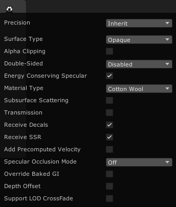 Fabric Materials use a Shader Graph Master Node which means you cannot edit any of its properties in the Inspector. Fabric Materials use a Shader Graph Master Node, so you need to use a specific process to create and edit a Material that uses it. For information on how to do this, see Customizing HDRP materials with Shader Graph.