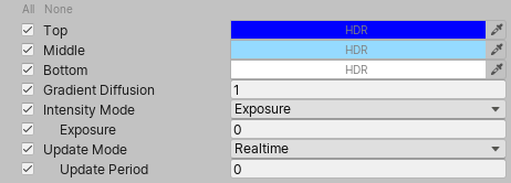 | Gradient Diffusion | Set the size of the Middle property in the Skybox. Higher values make the gradient thinner, shrinking the size of the Middle section. Low values make the gradient thicker, increasing the size of the Middle section. |