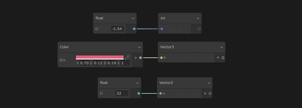 Properties can connect between base types to perform cast. Casts are useful in order to change the data type you are working on in order to inherit its specificites : for instance casting a float to integer to benefit from integer division.