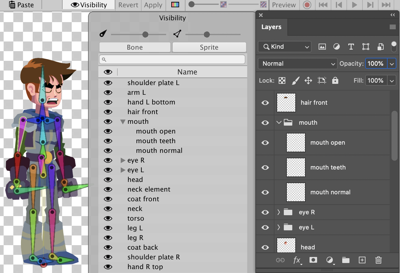 Sprite meshes within the editor window. Move either slider further to the left to decrease the visibility of the bones or meshes respectively, and to the right to increase their visibility.
