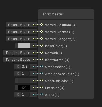 Fabric Materials use a Shader Graph Master Node which means you cannot edit any of its properties in the Inspector. Fabric Materials use a Shader Graph Master Node, so you need to use a specific process to create and edit a Material that uses it. For information on how to do this, see Customizing HDRP materials with Shader Graph.