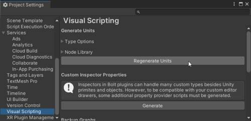 To enable the new input system nodes, you need to regenerate the Units. In the Project Settings window, select Visual Scripting and select the Regenerate Units button.
