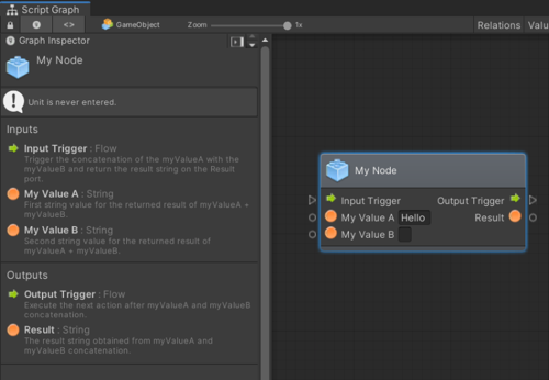 using Unity.VisualScripting; public class MyNode : Unit { protected override void Definition() //The method to set what our node will be doing. { } } -