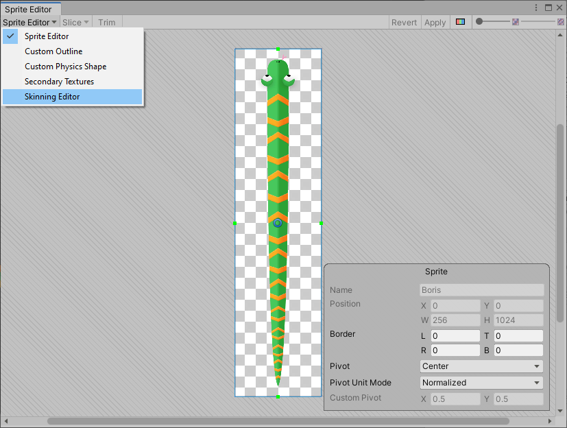 3. In the Sprite Editor, select the Skinning Editor module from the upper left drop-down menu of the editor window.