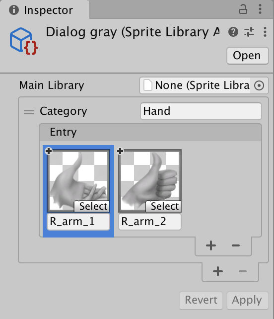 dialog grayGameObject, then assign thedialog gray.spriteLibAsset to its Sprite Library Asset property. - Expand the