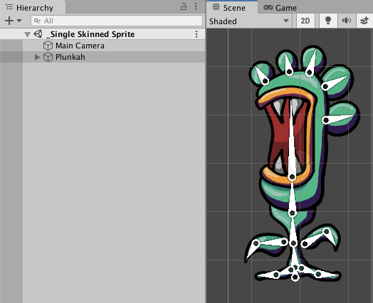 Open the Asset Assets/Samples/2D Animation/[X.Y.Z]/Samples/2 Single Skinned Sprite/Sprites/Plunkah.png in the Skinning Editor module to examine how the Sprite is rigged.