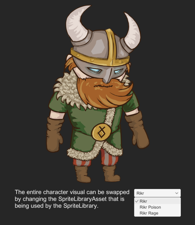 This sample demonstrates how to swap Sprite visuals by changing the referenced Sprite Library Asset referenced by the Sprite Library component, using the API provided. This sample uses the Assets and a similar setup to the Multiple Skinned Sprites sample, and builds on the Full Skin Swap sample.