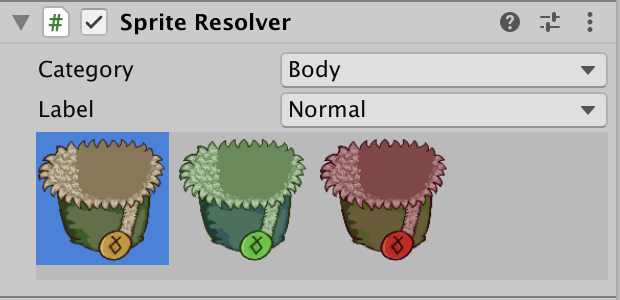 Add the Sprite Resolver component to each of the Sprite Renderers under the Rikr_Root GameObject. Assign a Sprite to each Sprite Resolver that corresponds to the body part they are attached to. For example, the Body Sprite is selected for the Sprite Resolver attached to the Rikr_Body GameObject.