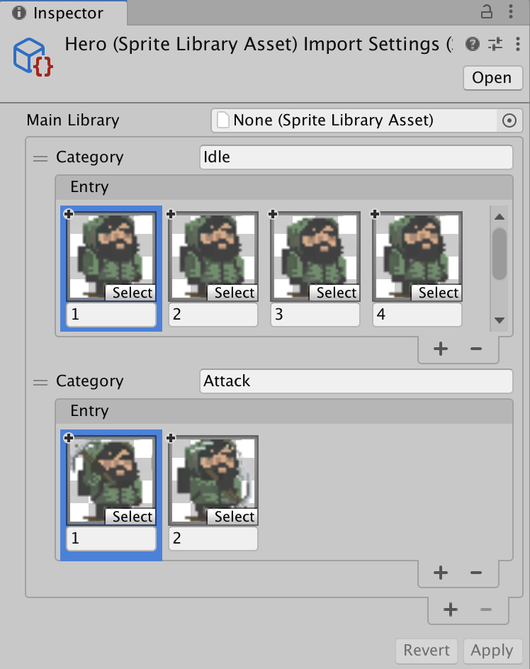 Hero.spriteLibto its Sprite Library Asset property. Then add the Sprite Resolver component to the same GameObject. - Add the Animation component. Locate the