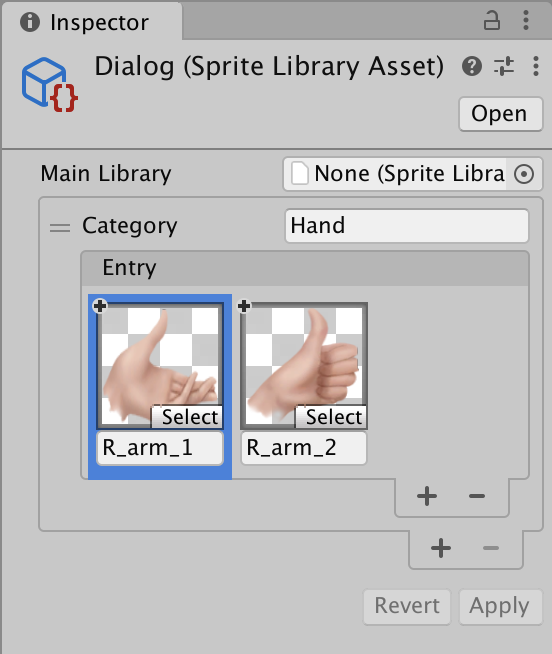 dialogGameObject, then assign thedialog.spriteLibAsset to its Sprite Library Asset property. - Add the Sprite Library component to