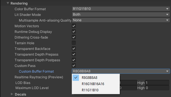To change the Buffer Format of the Custom Pass component in your HDRP Asset, go to Rendering > Custom Pass > Custom Buffer Format.