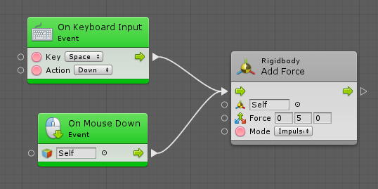 You can also connect multiple control output ports to a single control input port. For example, a jump force would be applied either when the player presses space or clicks on the object.