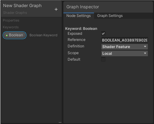 Boolean Keywords are either on or off. This results in two shader variants. Shader Graph uses the value in the Reference name field for the on state, and automatically defines the off state as an underscore ( _ ).