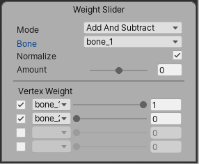 Add and Subtract Use the slider to increase or decrease the selected bones (currently displayed in the Bone property) influence on selected vertices. Increasing in