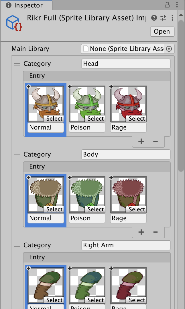 A Sprite Library Asset containing Sprites made from all three graphic Assets above is created. A Category is created for each body part of the actor, with three Entries derived from the three different versions of the character. The Asset is located in Assets/Samples/2D Animation/[X.Y.Z]/Samples/5 SpriteSwap/Sprite Library/Rikr Full.spriteLib.