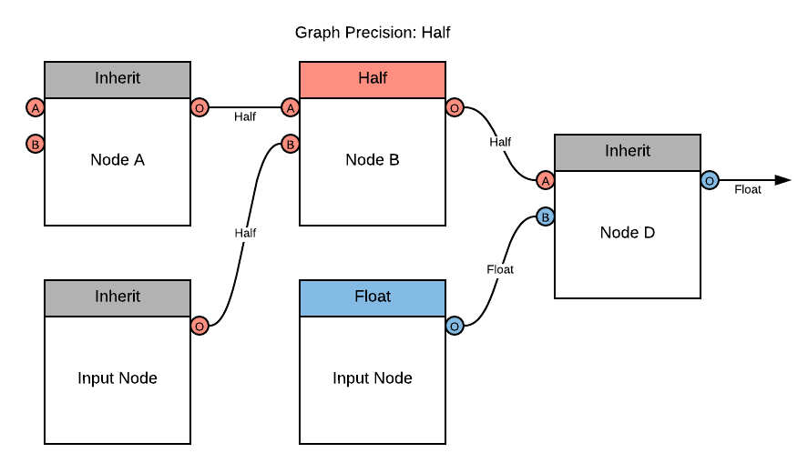For example, if you set Node A to inherit, it uses half as its precision mode because the Graph Precision is half.
