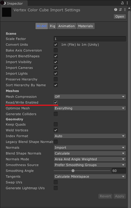 - If a Mesh is not readable, the Position (Mesh) Block and Sample Mesh Index Operator return zeros values when they attempt to sample it. For information on how to make a Mesh readable, see Model import settings