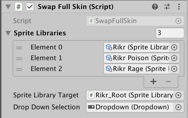 Where a value changes in the UI Drop Down List, the component sets the relevant Sprite Library Asset to be used for the Sprite Library component.