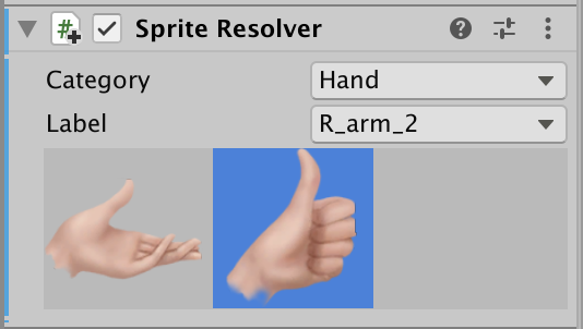 5. Go to the R_arm_1 GameObject, and add the Sprite Resolver component. Select the R_arm_2 graphic from the Label drop-down menu or from its thumbnail.