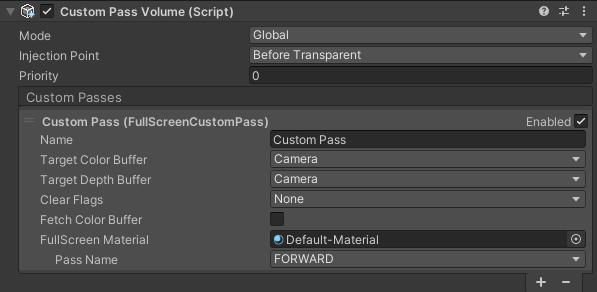 | FullScreen Material | The material this Custom Pass renders in your scene. |