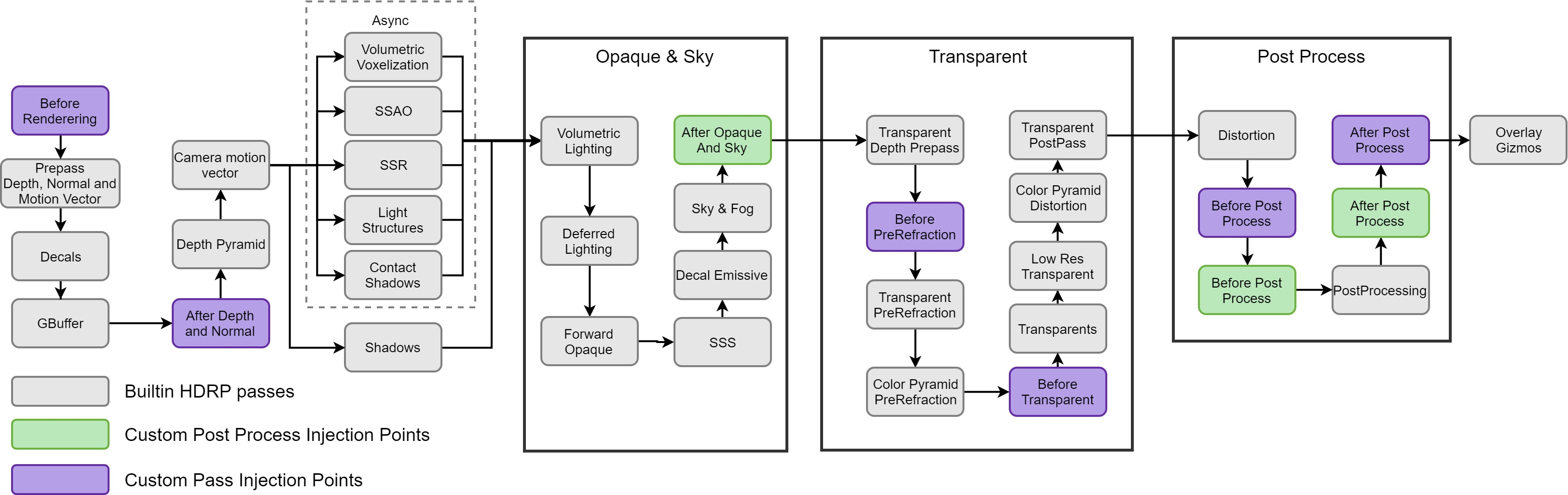 The following diagram describes where Unity injects Custom Passes into an HDRP frame: