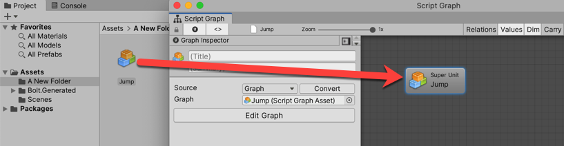 To use a script graph as a super unit, either drag and drop the script graph from the project window into the graph or add it from the Graphs category in the fuzzy finder.