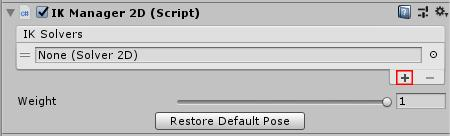 Weight measures the degree that a Solver’s solution affects the positions of the bones/Transforms in the chain. The IK Manager 2D has a master Weight property that affects all Solvers it controls. It is applied in addition to the Solver’s individual Weight settings.
