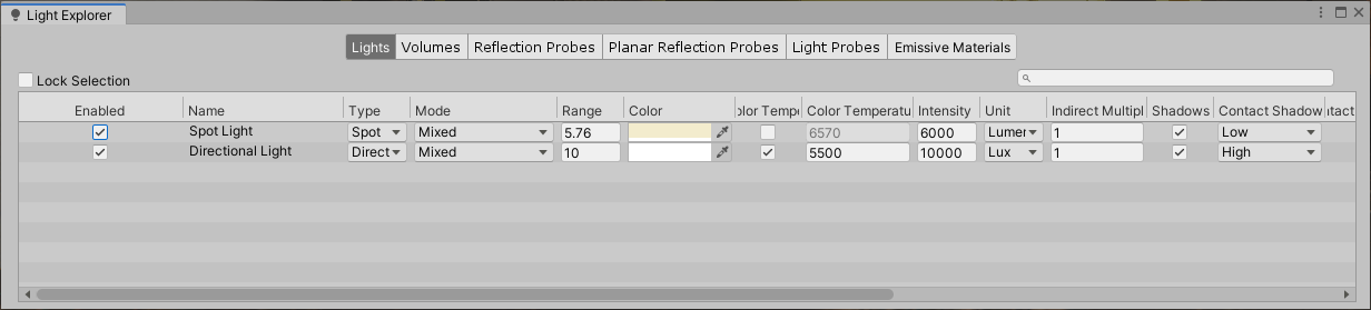 The Light Explorer allows you to select and edit light sources: Directional lights, Point lights, Spot lights, Area lights, Reflection Probes, Planar Probes and Sky and Fog volumes