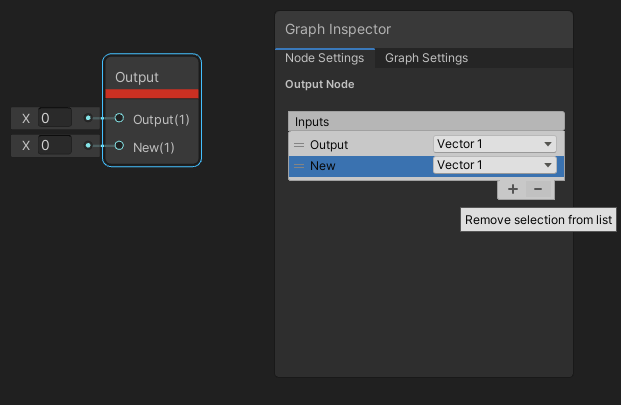 The Custom Port Menu is displayed in the Node Settings tab of the Graph Inspector by clicking on the Custom Function Node and Sub Graph output node. This menu allows you to add, remove, rename, reorder, and define the types of your custom input and output ports.