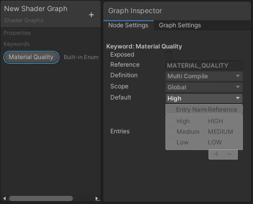 Default Enum Select an entry from the drop-down menu to determine which value to use for the Keyword when Shader Graph generates previews. It also defines the Keyword's default value when you use this shader to create a new Material. When you edit the Entries list, Shader Graph automatically updates the options in this dropdown menu.
