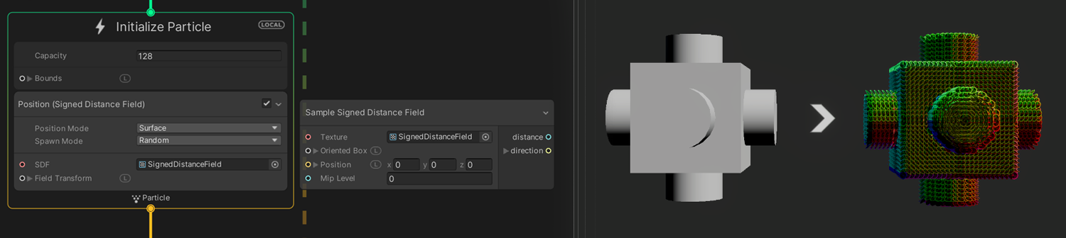 This version of the Visual Effect Graph introduces improvements to working with signed distance fields (SDFs). It added a new Operator to sample SDFs as well as a new Block to set a particle's position based on an SDF.
